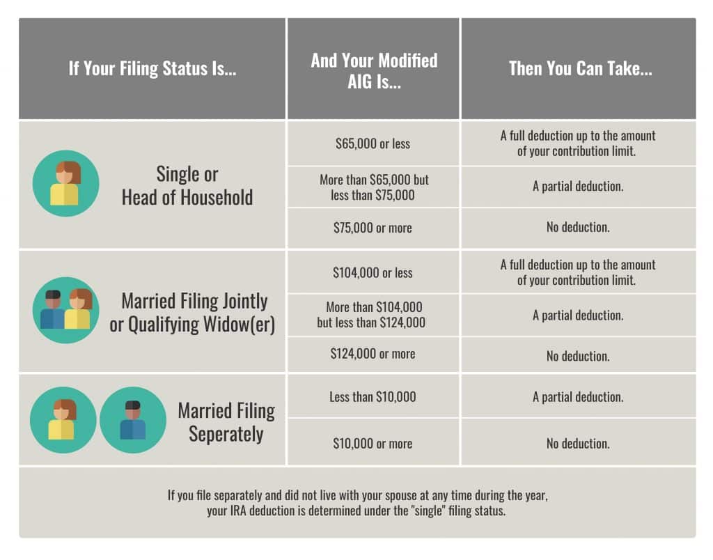 To better understand IRA investment rules and gold IRA rules related to contributions and deductions in 2020, refer to the following charts: