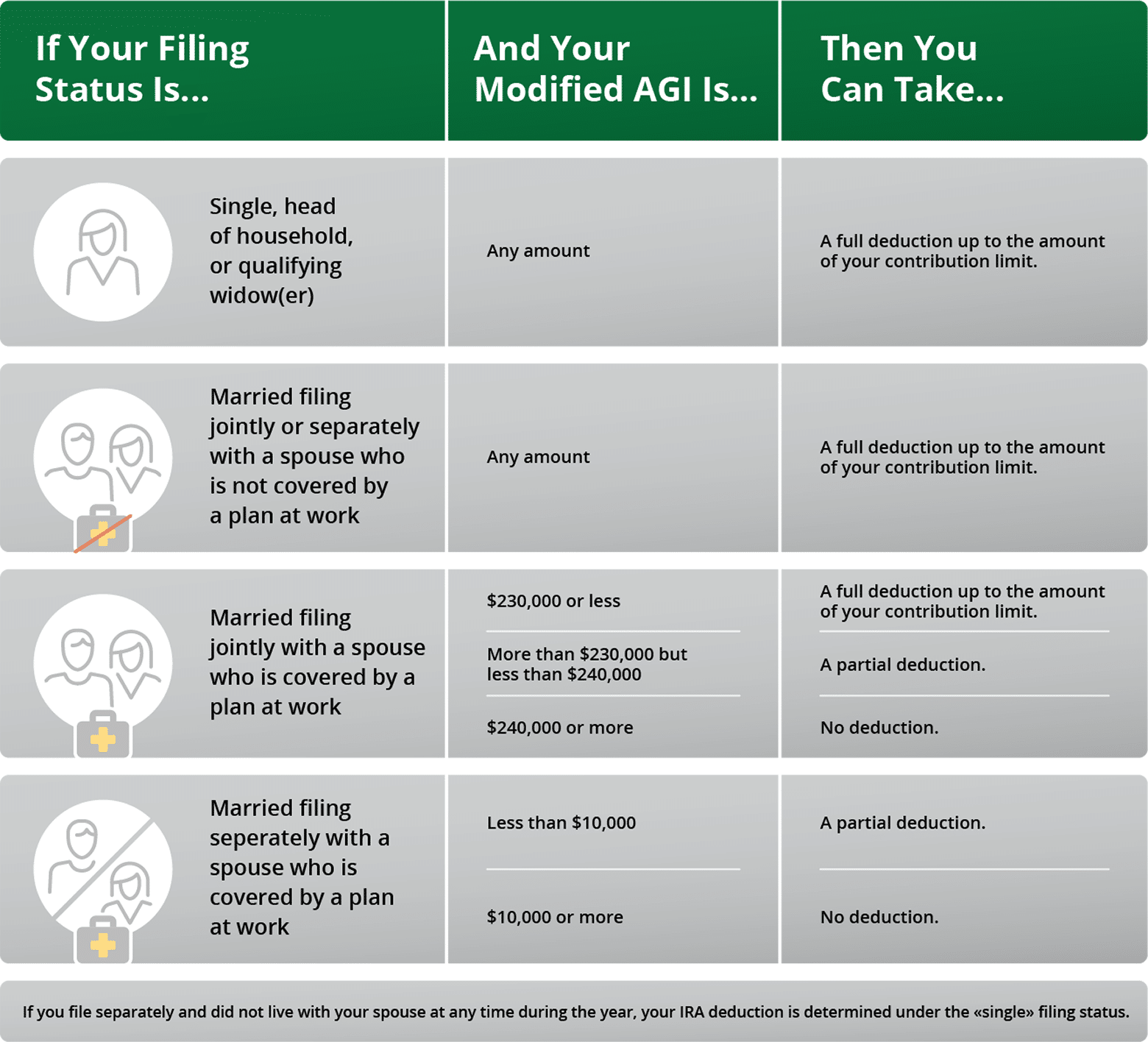 - Work retirement plan deductions may be limited if you or your spouse are covered by a retirement plan through your employer, and if your income exceeds certain levels.
