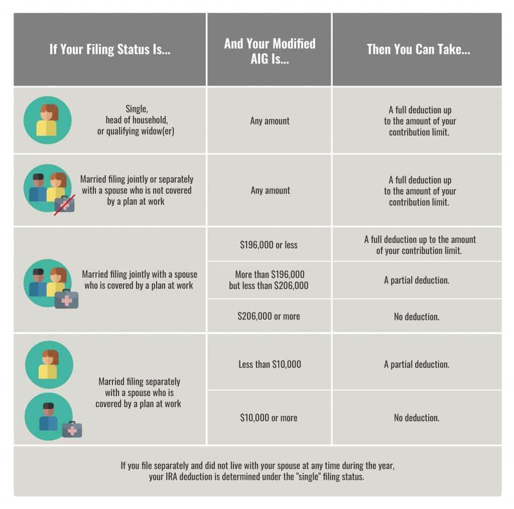- No work retirement plan means you are allowed to take a deduction in full if you and your spouse (if married) aren’t covered by an employer-sponsored retirement plan