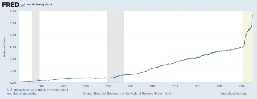 In fact, if you look at the figures for money supply, they are growing exponentially, at unprecedented rates. The M1 money stock has risen over 70% this year, far more than the 20% it grew during the 2008 financial crisis. M2 and MZM have seen smaller percentage increases, but their trend is also to grow straight up.